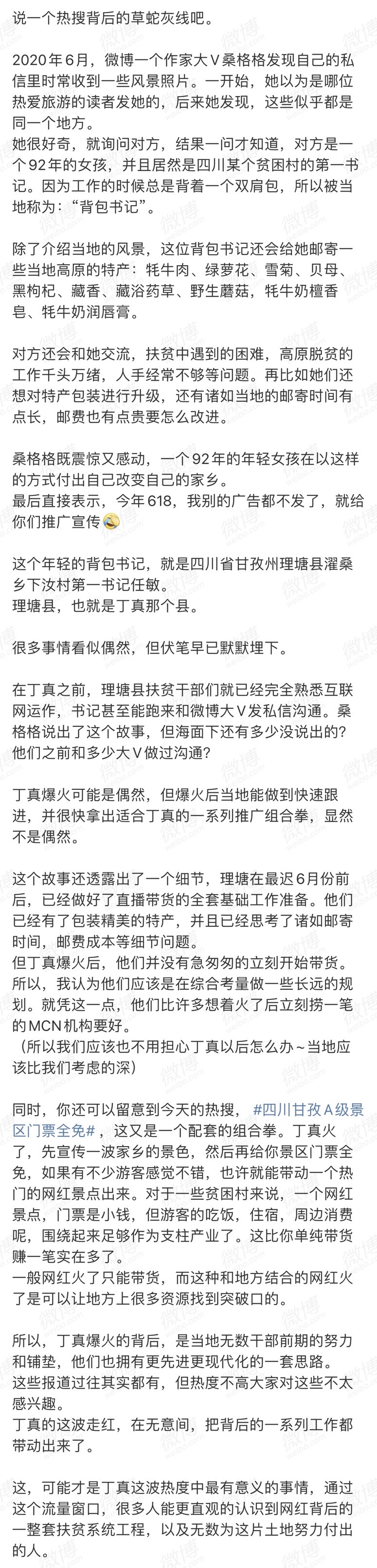 有网友发现,半年前,理塘的一位90后村第一书记已经开始和微博大V围绕当地的风景、扶贫、带货进行沟通交流。随后还有网友评论跟进说,为了通过旅游发展突围,当地曾举办过“最美康巴汉子选拔大赛”;理塘37岁书记驻村一年满头白发;……“你看到满屏的丁真,其实都是脱贫攻坚,国计民生,是无数人的奋斗和汗水。”