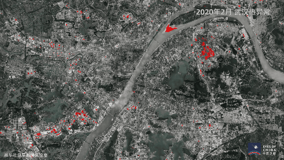 这是武汉市2020年10月与2月的热异常对比。卫星数据显示,10月较2月高于平均温度5度的区域面积增长了4.3倍。(红色代表该地地面温度高于整个地区平均气温,通常来自火灾、工业/能源生产和大密度的人口生活、生产。)