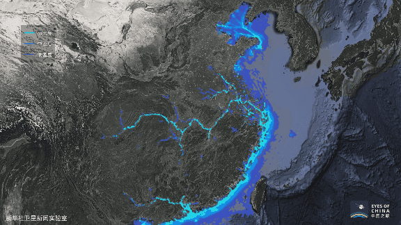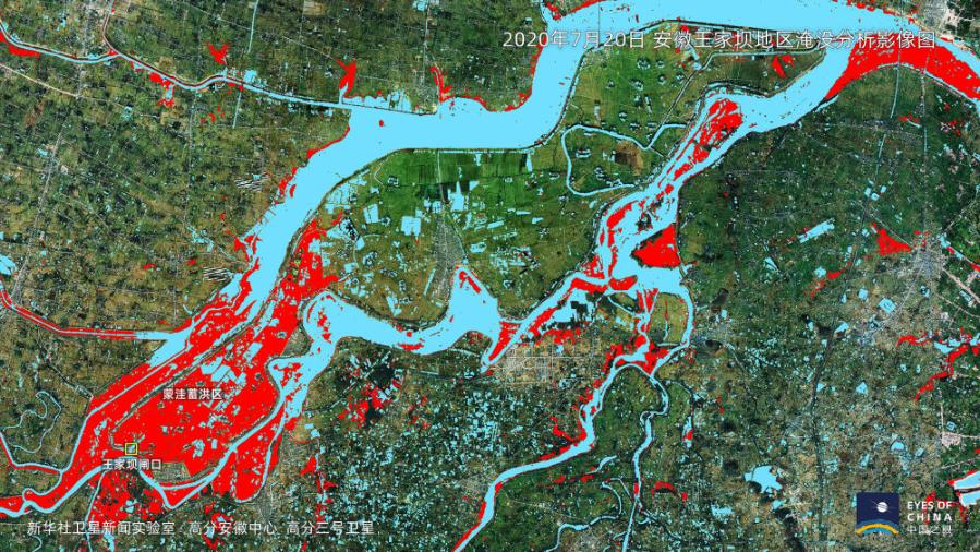 这是合成孔径雷达卫星拍摄图。2020年7月20日,为上游减压,中游缓险,保下游安全,淮河流域的蒙洼蓄洪区启用,图中红色部分为开闸后被淹没区域。