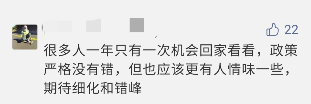 随着购票政策的调整,春节能不能回家这一问题引发网民热议,“理解疫情防控难处,但还是很想回家过年”“到底要不要买票回家,还在纠结中”“各地防疫措施不一样,想知道回家需不需要核酸检测,需不需要隔离”,也有网民提出“选择‘就地过年’,对自己负责,对家人负责”。