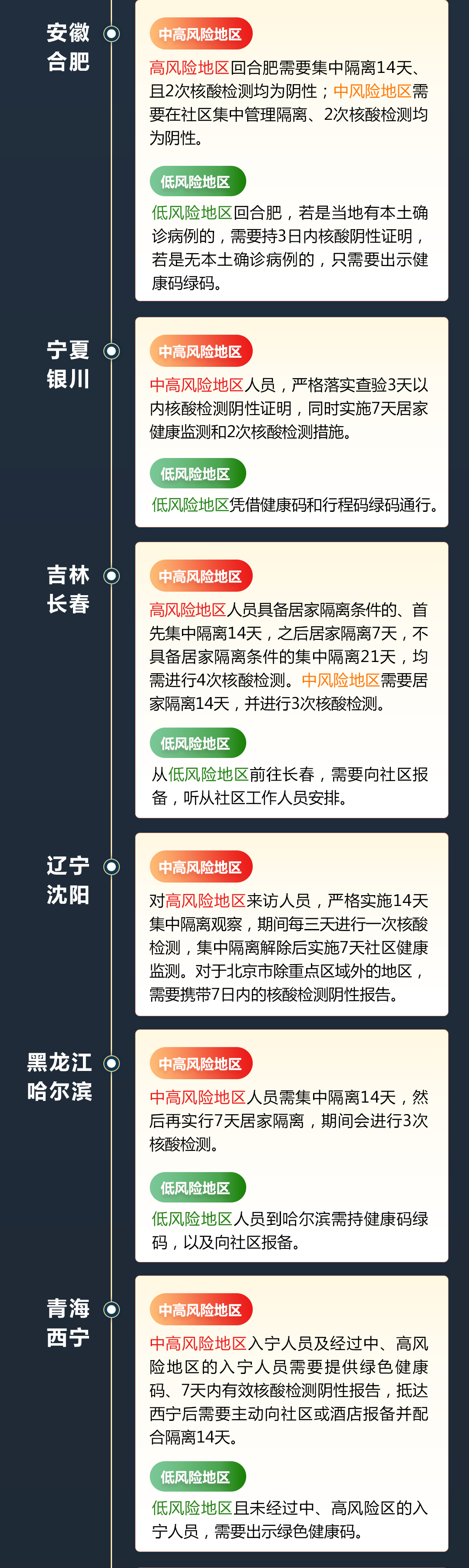 目前,全国31省区市均出台了返乡隔离政策。各地政策有一定区别,但均要求中高风险区返乡人员接受隔离,同时进行核酸检测。