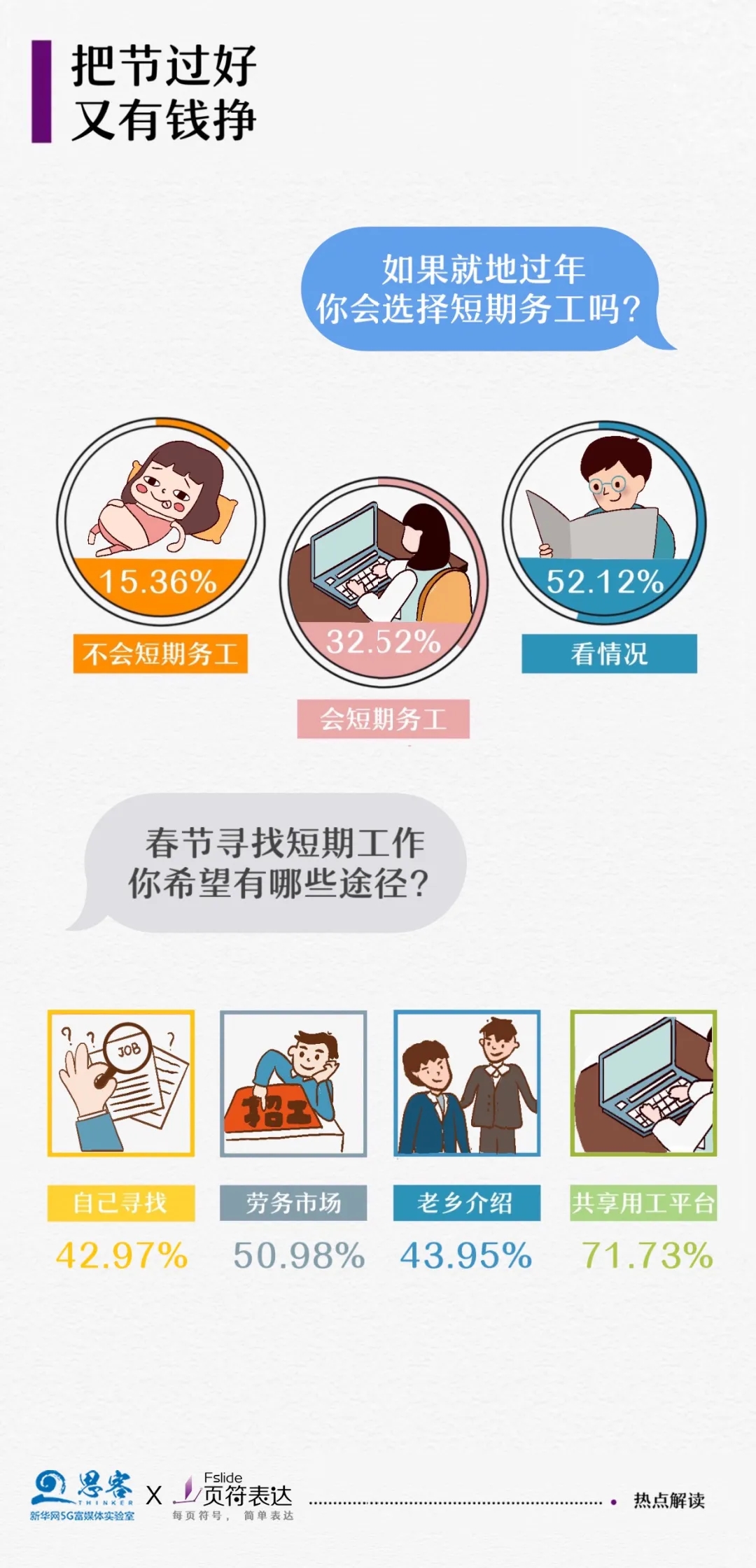 在享受福利政策同时,32.52%的受访者希望就地过年期间可以短期务工。一些受访者说“闲着也是闲着”,想借春节假期找份临时工作增加收入。北京等地为保障外来就业人员就地过年,用岗留人,提出发挥“共享用工”平台的作用,正好为有短期务工需求的人提供获取工作机会的渠道,从而让他们安心、开心留下来。