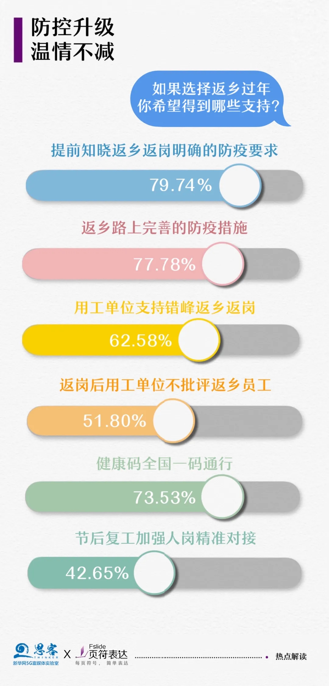 想回家过年的人最希望提前知晓返乡返岗明确的防疫要求,占比为79.74%。在参与调查的受访者中,11.78%的人渴望回家过年。鼓励就地过年,并不是阻断返乡的路。不少网民认为,各地在政策执行时不仅要明确,还不能擅自加码,更不能层层加码。