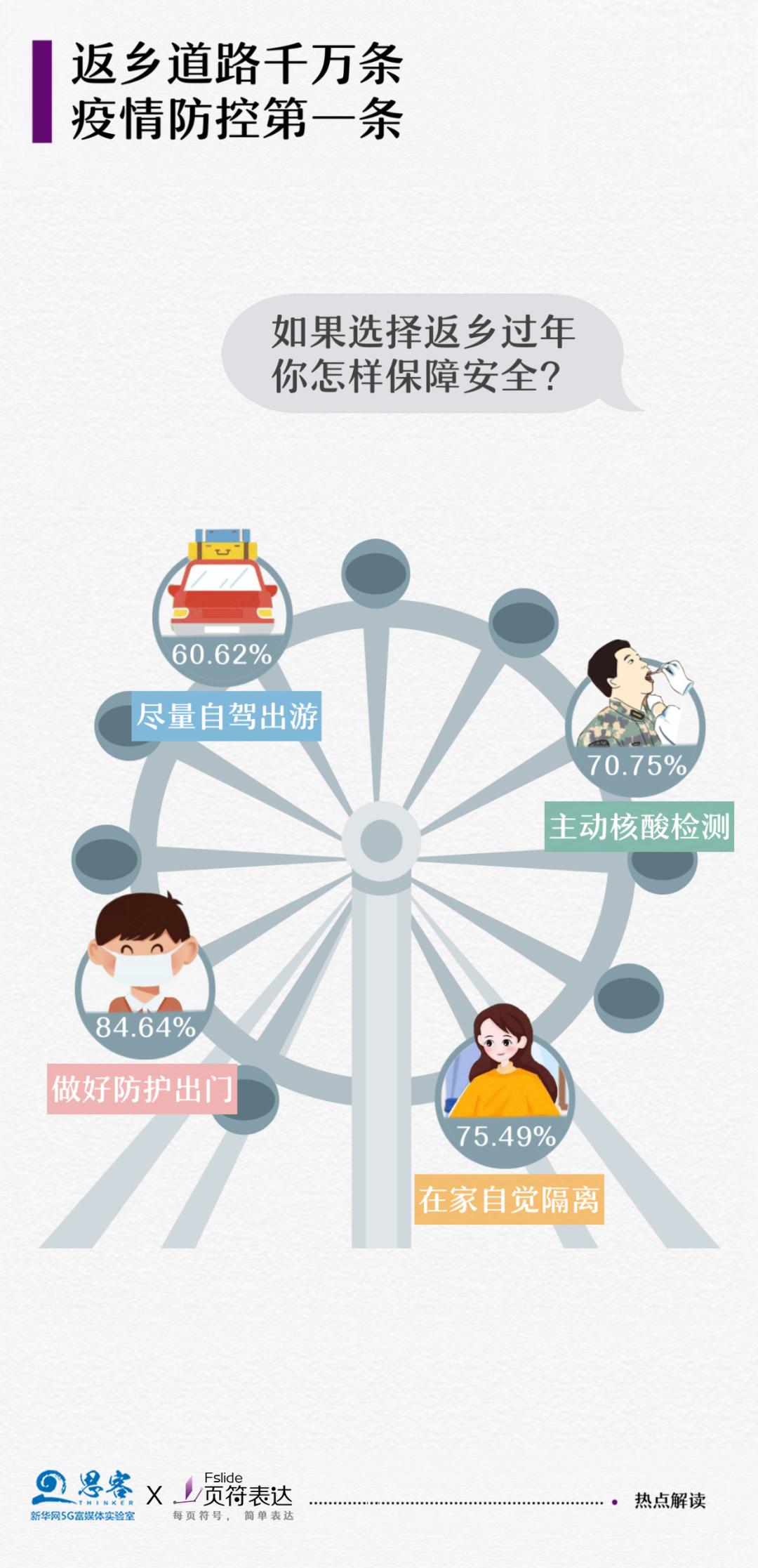 除了做好防护出门、回家自觉隔离、主动核酸检测外,还有60.62%的受访者选择尽量自驾出游。返乡回家,防疫意识同样不能松懈。有受访者说,少接触人群就少一份危险,春运期间,自驾是“最优解”,还便于随时照顾老人小孩。