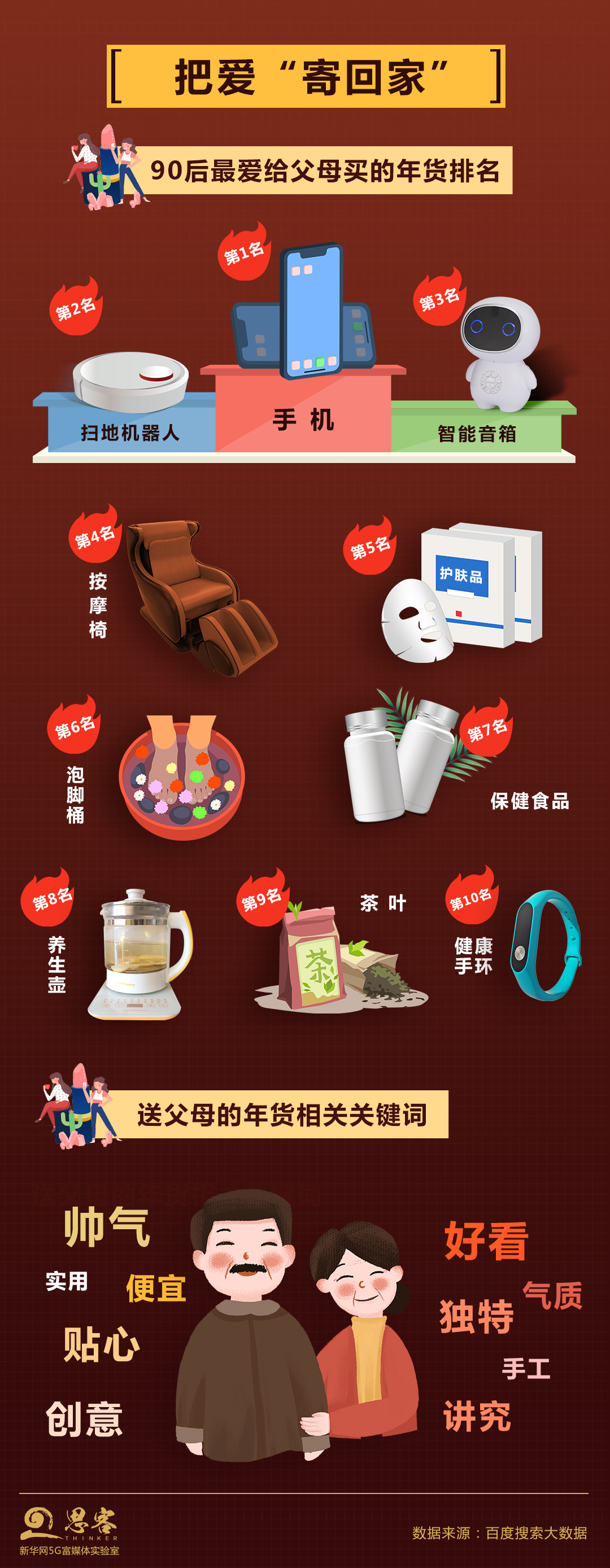 智能+健康,90后精挑细选的礼物里折射出对父母的满满孝心。不回家过年,父母的健康是远在异乡儿女最大的牵挂。在90后最喜欢送父母的年货礼物榜单中,除手机、扫地机器人、智能音箱等实用性强的科技产品外,按摩椅、护肤品、养生壶等与健康相关的产品占据了很大比例。