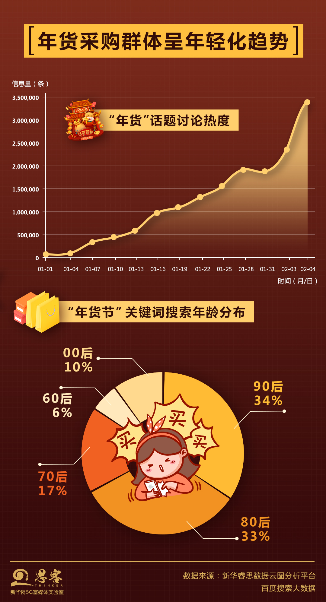 其中90后对年货购置的热情最高,占关注“年货节”群体的34%,成为在线采购年货的主力军。不少“就地过年”的年轻人,希望通过网购年货送回家的方式为家乡的亲人送上新春祝福。