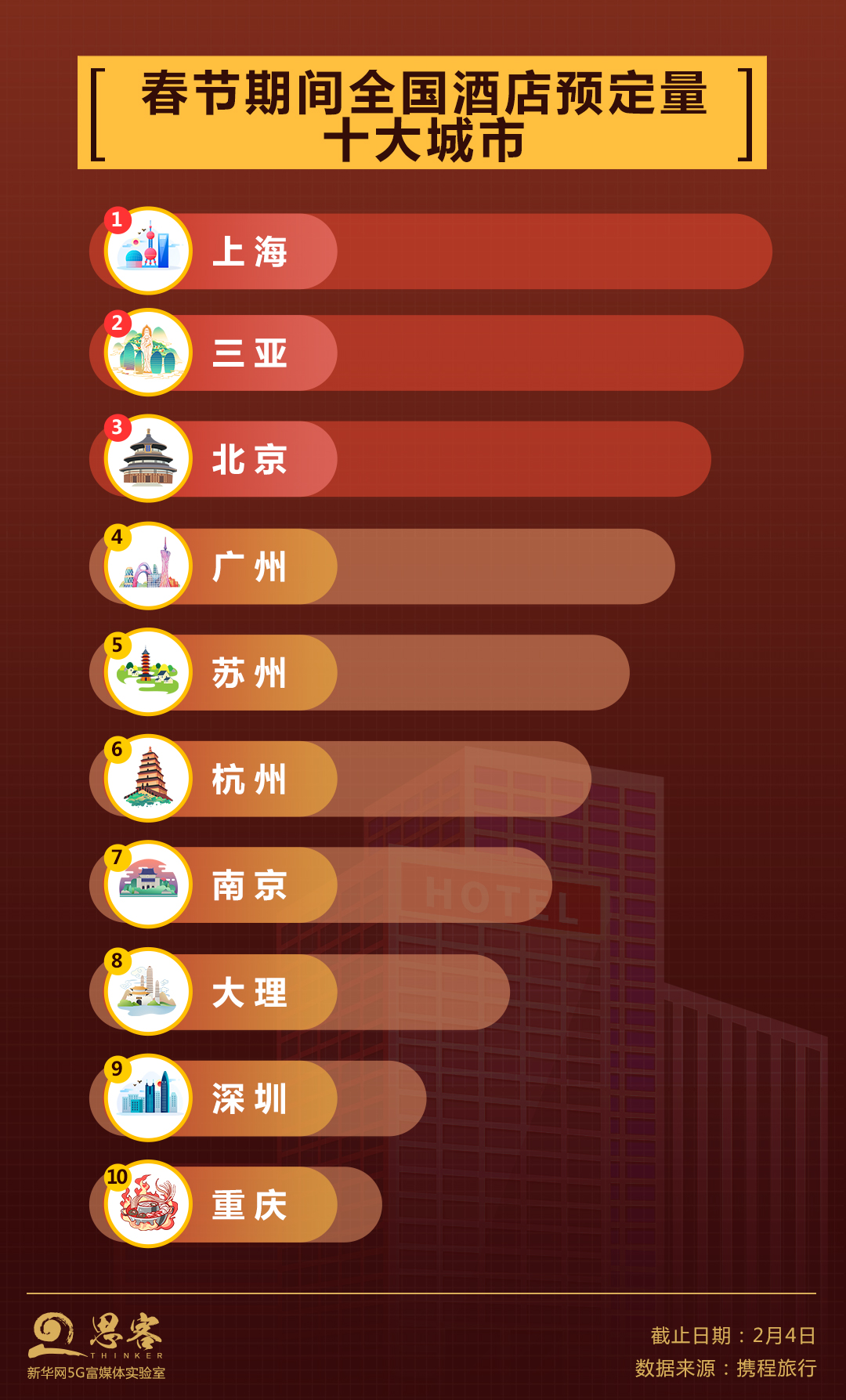 “酒店即目的地”概念走热,不出城也要换个环境过年。携程数据显示,在春节酒店订单中,高星酒店(4星、5星)合计占比高达66.8%,预订量前十城市基本都集中在一线、新一线或休闲度假型城市,本地客源贡献了绝大部分订单。