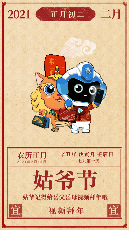 “正月初二,姑爷节”。这一天,各地习俗不尽相同,有的是女婿要亲自下厨做一桌好菜,有的是要替老丈人干一些家务活,虽然形式不同,但都体现了团圆、和谐、和睦的伦理亲情。姑爷们,即使不能回家,也要记得给岳父岳母视频拜年说说吉祥话哦!
