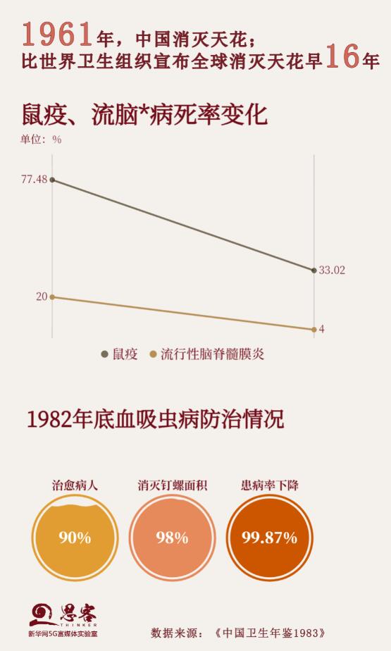 在多方努力下,我国人口预期寿命不断提高;1961年,我国第一个宣布消灭天花;与此同时,甲、乙类法定报告传染病发病率、死亡率快速下降。出生婴儿死亡率从约250‰减少到1981年的低于50‰。