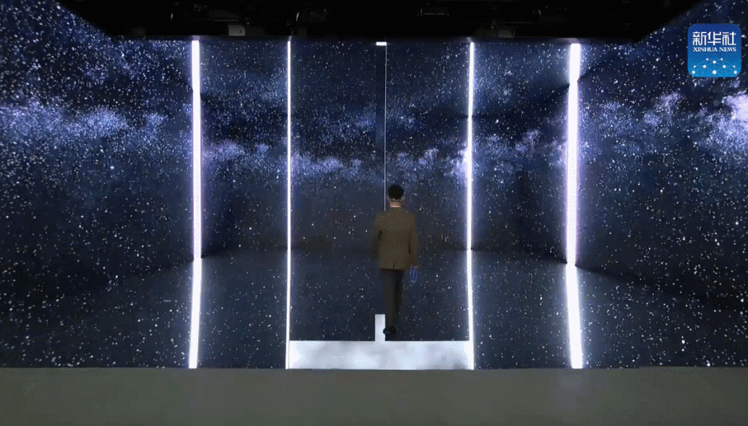 作为拍摄主场地的新华社新立方智能化演播室,在2019年设计之初,就充分考虑了技术和应用场景。5G沉浸式多地跨屏访谈,是演播室今年1月底交付使用后完成的第一件作品。
