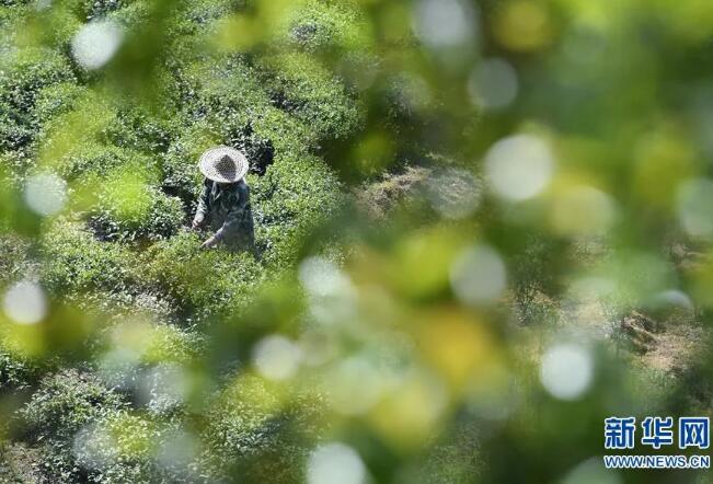 ▲2020年4月9日,合作社社员蔡世春在下党村扶贫定制茶园采摘茶青。新华社记者 林善传 摄
