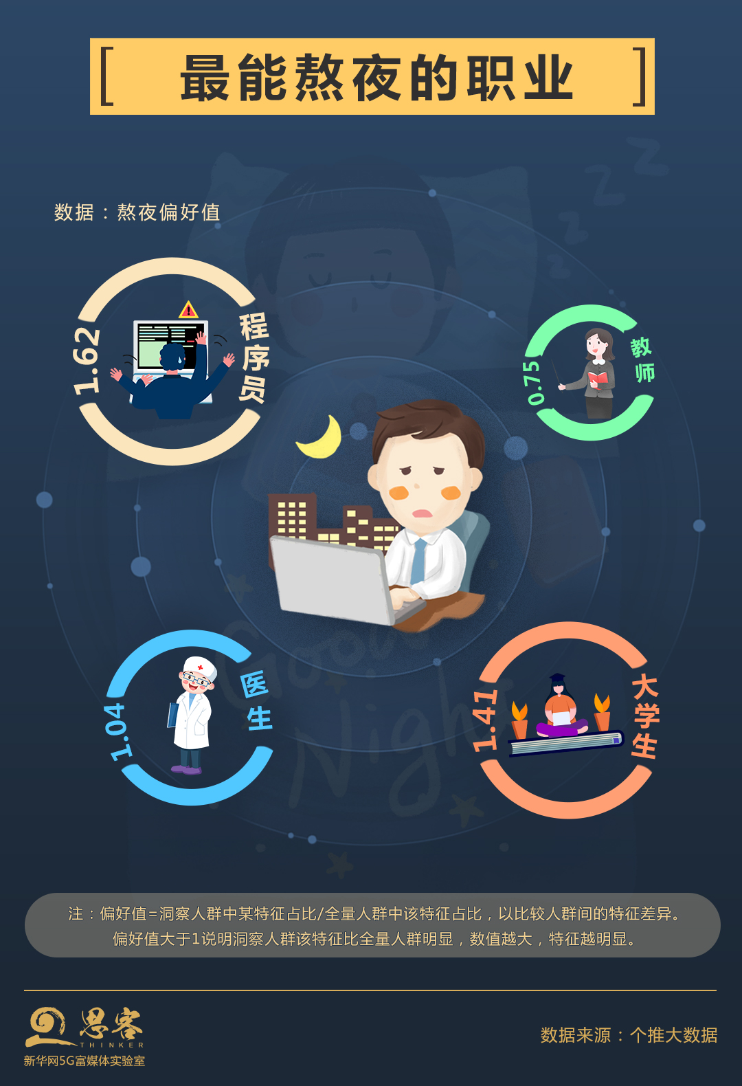 从行业分布上看,程序员是当仁不让的熬夜“最强王者”,其熬夜偏好值为1.62。这一群体与网络结合得最为深入,越来越快的工作节奏让他们在网上停留至深夜成为常事。