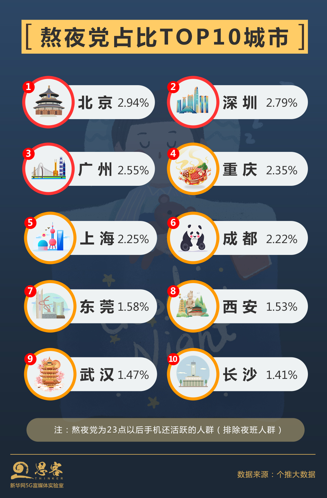 从地域上看,熬夜呈现出“南北差异”。熬夜党占比排名前10的城市中,有8个属于南方城市,北方只有北京和西安。但经济发展迅速,城市生活节奏快,娱乐文化比较发达无疑是这些城市的共同点。