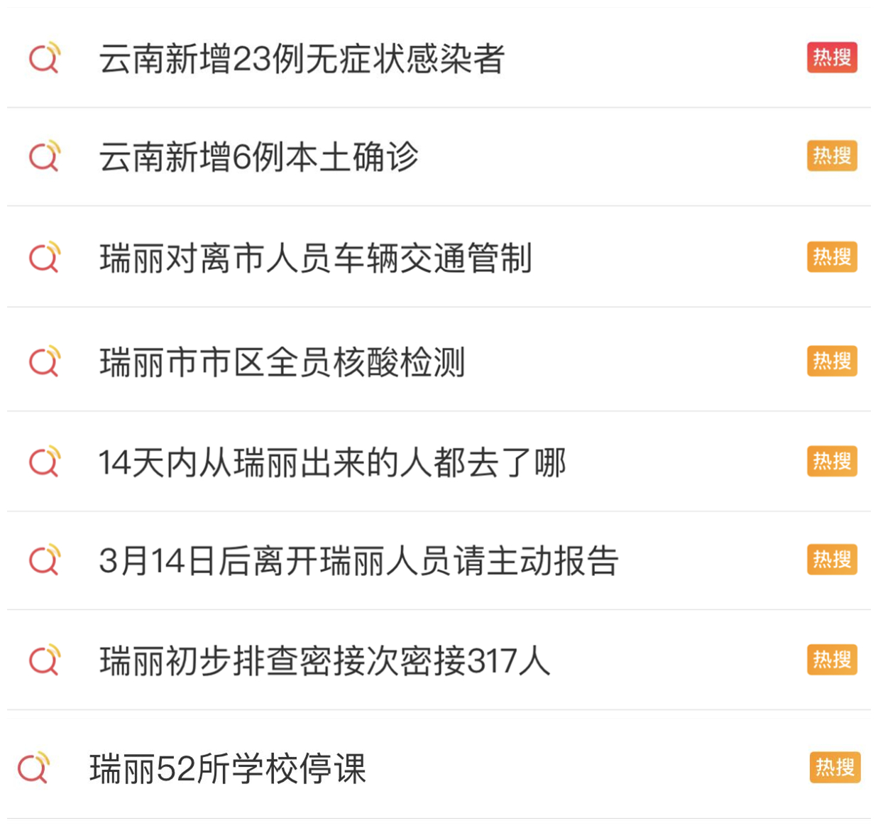 云南瑞丽3月30日新增本土确诊病例6例、无症状感染者3例,打破了内地省份持续多日的“本土零新增”状态,引发网民关注。截至4月1日16时,有8个相关话题登上微博热搜,“瑞丽市对离市车辆人员交通管制”“瑞丽初步排查密接次密接317人”“瑞丽城区居民暂定居家隔离一周”等话题讨论热度较高。