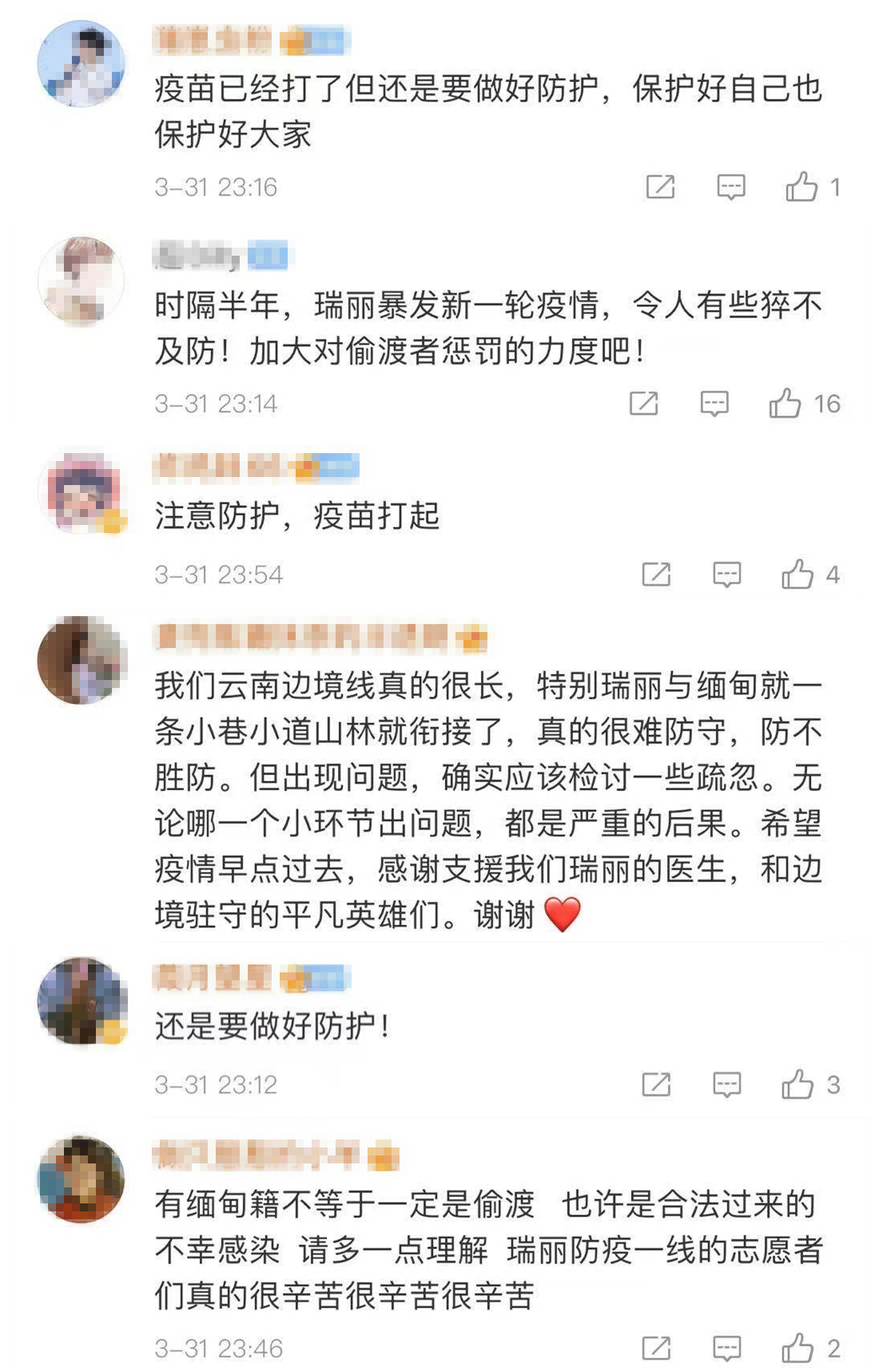边境地区的疫情防控网要织得更密,疫情防控工作要抓得更细。去年9月,瑞丽曾报告2例缅甸输入病例,系非法偷渡入境。关于本次疫情是否与偷渡问题有关的讨论也在网上时有出现。有网民说,“瑞丽疫情暴发令人猝不及防,加大对偷渡者的惩罚力度”“云南边境线很长,盯得再严,有时偷渡者也防不胜防”“有缅甸籍不等于一定是偷渡”。