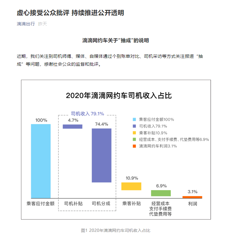 对此,5月7日晚,滴滴出行通过官方社交账号公开回应“高抽成”问题,表示虚心接受公众批评,并将持续推进平台收费定价公开透明。