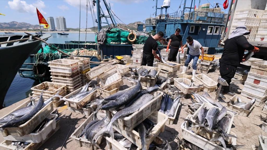 近日,在山东荣成成山镇一处渔港,开海后首批归来的渔船靠港卸鱼,捕捞的渔获品种主要以鲅鱼为主。