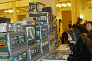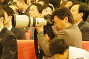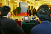 参加温总理记者招待会的记者通过电视监视屏了解反分裂国家法投票情况
