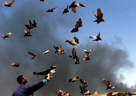 巴格达人在硝烟中放飞鸽子