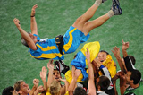 闭幕式结束后运动员与福牛乐乐在一起[图]