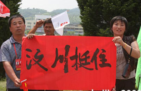 龙岩市古田传递沿线民众高举“汶川挺住”横幅