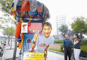 超级奥运粉丝现身北京 顶“五环”身文“中国印”