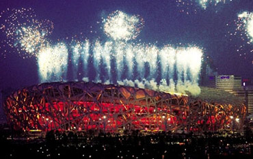 “鸟巢”首次全身亮灯彩排 璀璨烟花组成五环图案