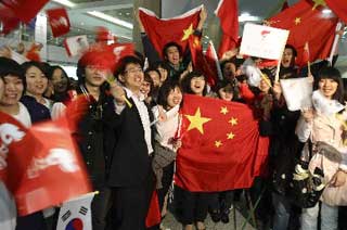跨国连线:韩国祝福北京奥运 巨大国旗现场助威