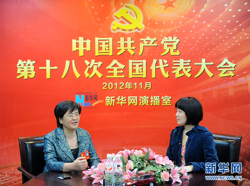 2012年11月6日,十八大代表、江苏省科协党组副书记、副主席陈惠娟作客新华网设在京西宾馆的十八大访谈间,与网友在线交流。新华网 陈竞超 摄