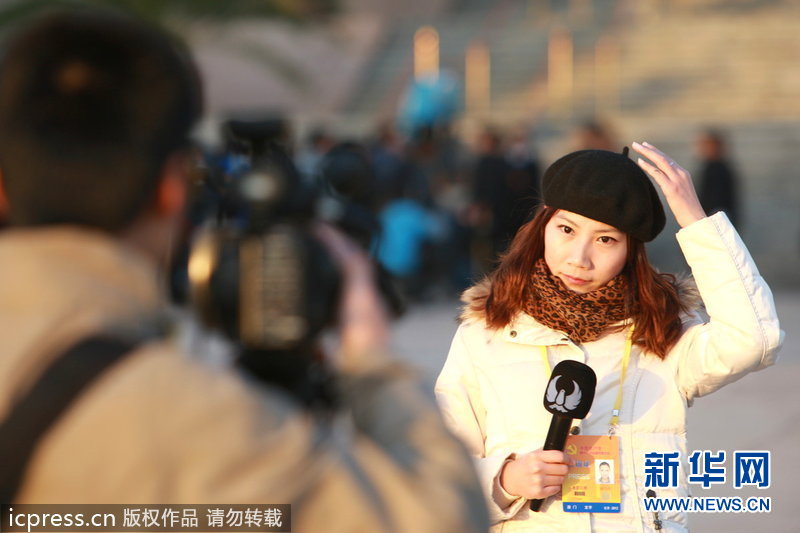 11月7日的中国共产党第十八次全国代表大会新闻发布会上,十八大新闻发言人蔡名照透露,报名采访本届大会的注册记者共有2732位,其中境外记者达到1704人。图为一名采访十八大开幕会上的记者出镜前正在整理帽子。(图片来源:东方IC)