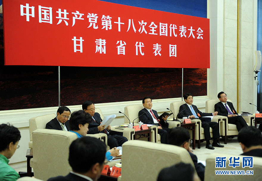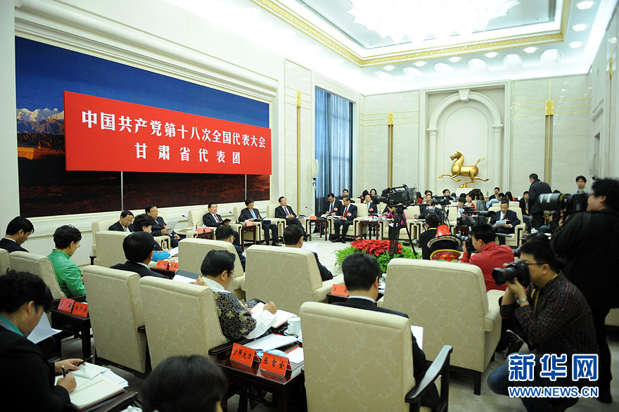 11月8日,中国共产党第十八次全国代表大会在北京人民大会堂开幕,当日下午,甘肃省代表团讨论对中外记者开放。新华网 陈竞超 摄