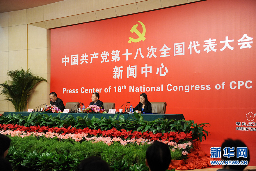 2012年11月9日,十八大新闻中心举行记者招待会,中共中央组织部副部长王京清介绍党的建设工作,并回答记者提问。图为记者会现场。新华网 陈竞超 摄