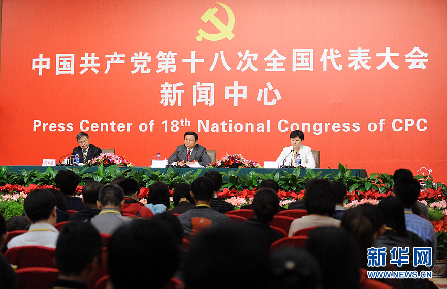 11月10日,十八大代表、商务部部长陈德铭在十八大新闻中心接受媒体集体采访。图为集体采访活动现场。新华网 陈竞超 摄