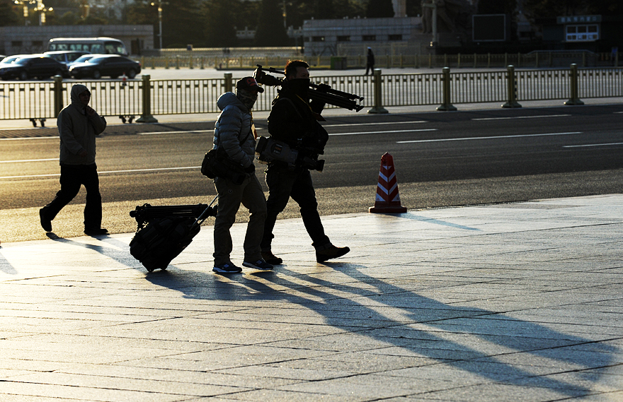 11月14日,中国共产党第十八次全国代表大会在人民大会堂举行闭幕会,图为当天清晨早早赶到天安门广场等待采访的各路记者。新华网 陈竞超 摄
