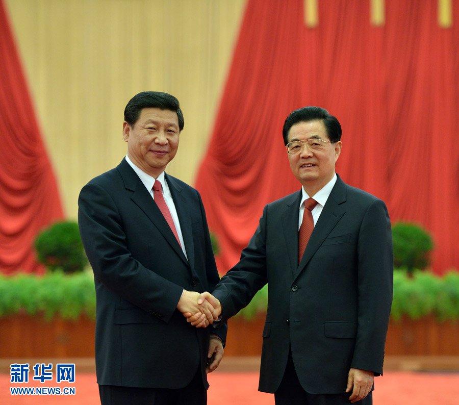11月15日,国家主席胡锦涛,新当选的中共中央总书记、中共中央军委主席习近平等领导同志在北京人民大会堂亲切会见出席党的十八大代表、特邀代表和列席人员并发表重要讲话。这是胡锦涛和习近平亲切握手。新华社发