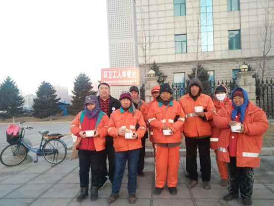 3月8日开始,团队队员凌晨4点起床给法院的300多人做早餐,队员们还要多做出14份给广场上的环卫工人,为此他每天要比以前早起床1个小时,到现在已经给环卫工人义务送早餐246天。每天团队队员一起拎着刚刚做好的14份早餐来到海城兴海广场上的一处小凉亭,14名环卫工人就放下手中的清扫工具,聚在小凉亭里,一碗小米粥、一个花卷、三种小菜还有一个煮鸡蛋,这份简单的早餐,让每位环卫工人脸上都洋溢着幸福的笑容。