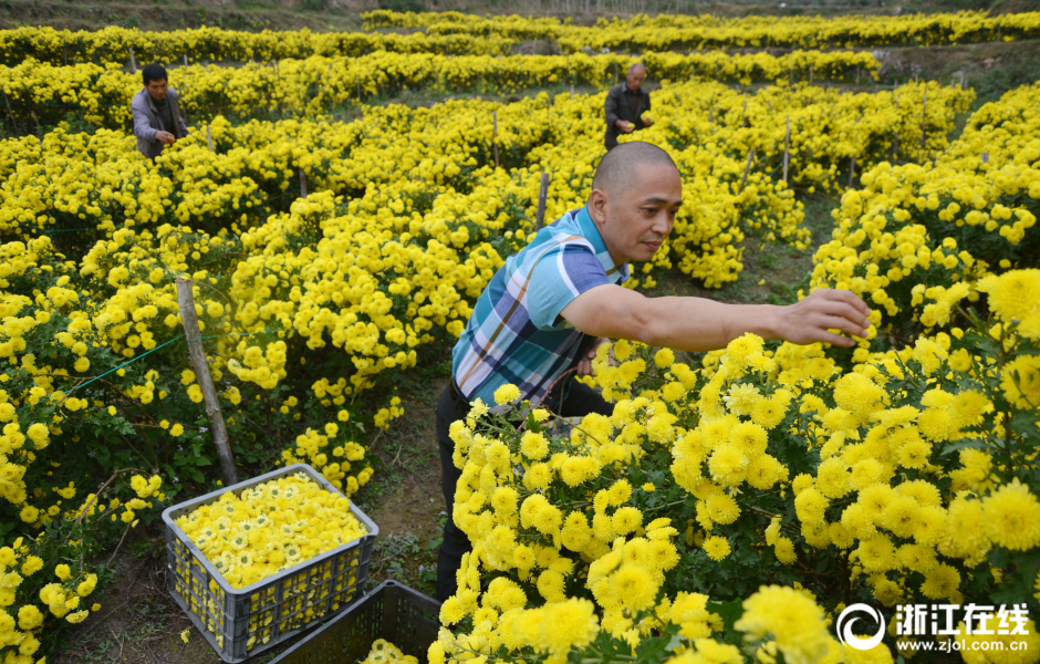 11月15日,玉环市龙溪镇正林堂中药材种植合作社菊花园里,一片片菊花金黄灿烂,置身于菊花馨香里的花农们和游客们正抢采菊花,实现种植中药材的药用、观赏等多种价值。(浙江在线拍友 詹智 摄)