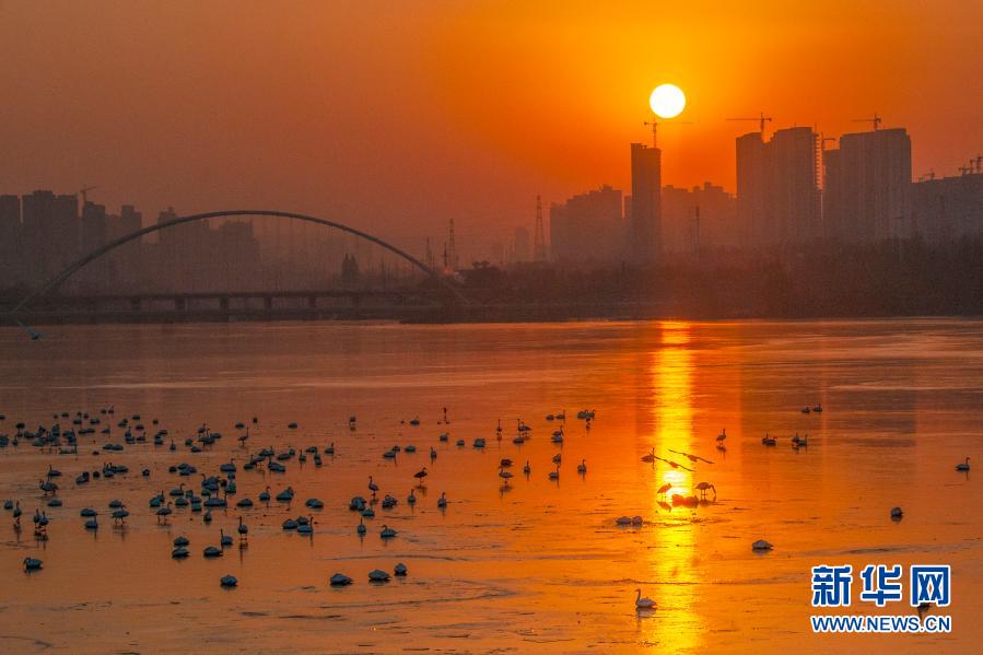 2021年1月1日在河南省三门峡市天鹅湖国家城市湿地公园拍摄的朝阳。新华社发(杜杰 摄)