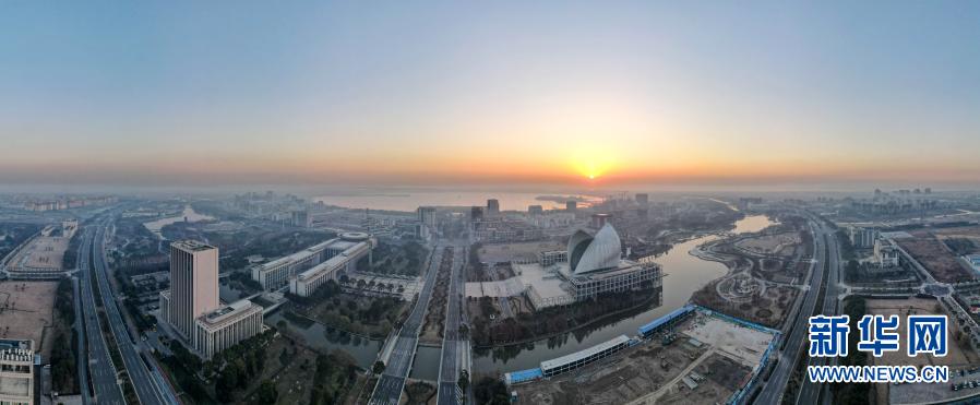 这是2021年1月1日在上海临港滴水湖畔拍摄的日出(无人机全景照片)。当日是新年第一天,朝阳升起,万象更新。新华社记者 方喆 摄