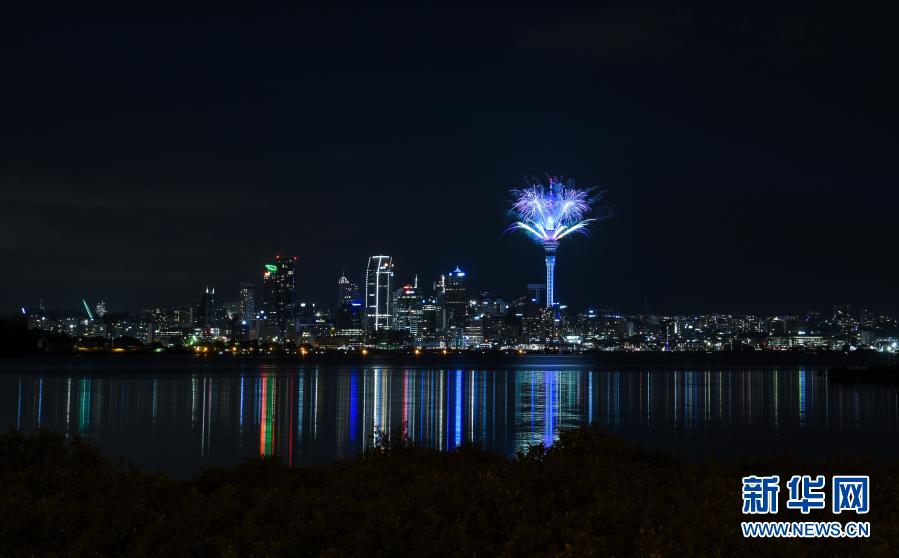 1月1日凌晨,新西兰奥克兰地标建筑天空塔上燃放焰火,迎接新年到来。