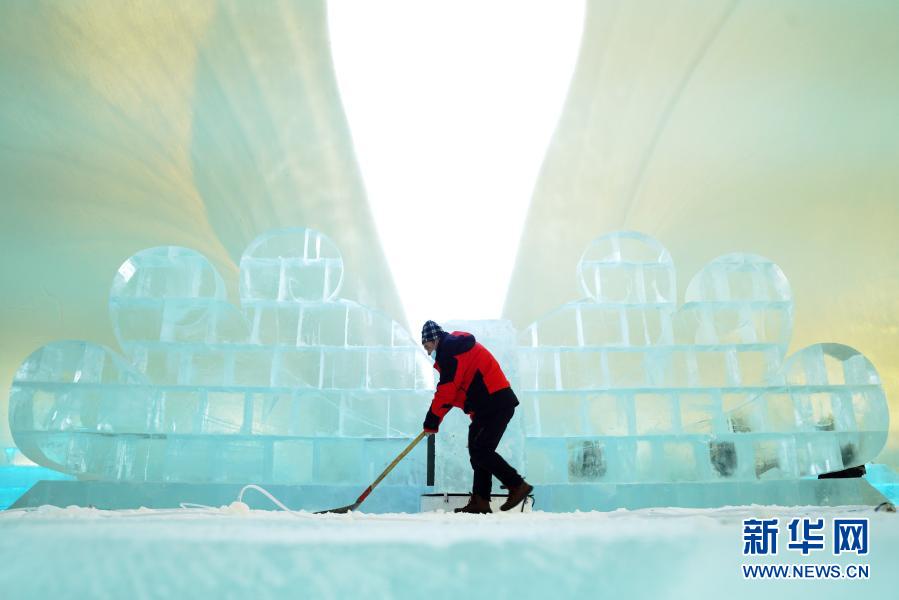 在哈尔滨冰雪大世界园区,孙宏岩进行冰建内饰项目收尾工作(2020年12月31日)。