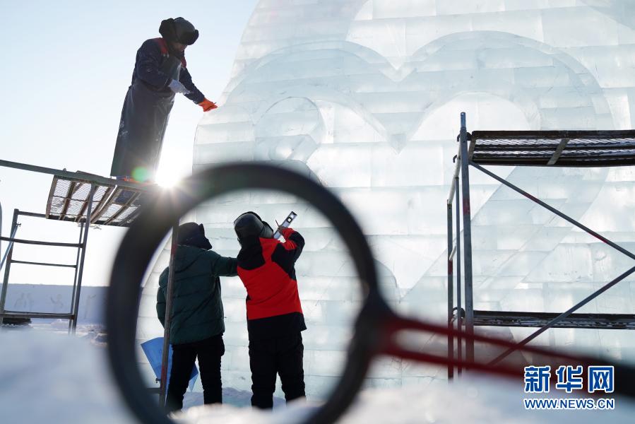 在哈尔滨冰雪大世界园区,孙宏岩(右)在进行冰雕艺术景观制作(2020年12月16日)。新华社记者 王建威 摄