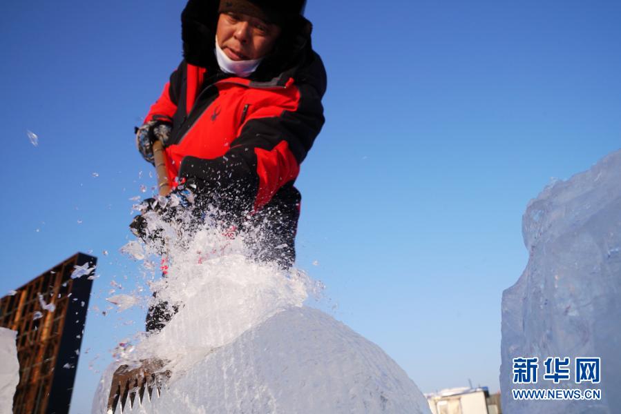 在哈尔滨冰雪大世界园区,孙宏岩进行冰雕艺术景观制作(2020年12月16日)。新华社记者 王建威 摄