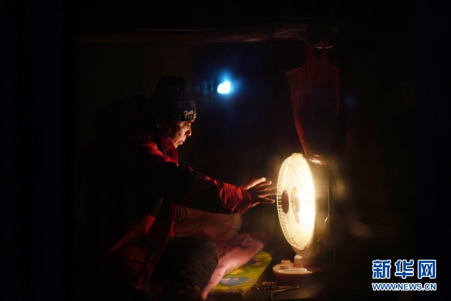 在园区外的临时休息室,孙宏岩在电暖风旁暖手(2020年12月17日)。新华社记者 王建威 摄