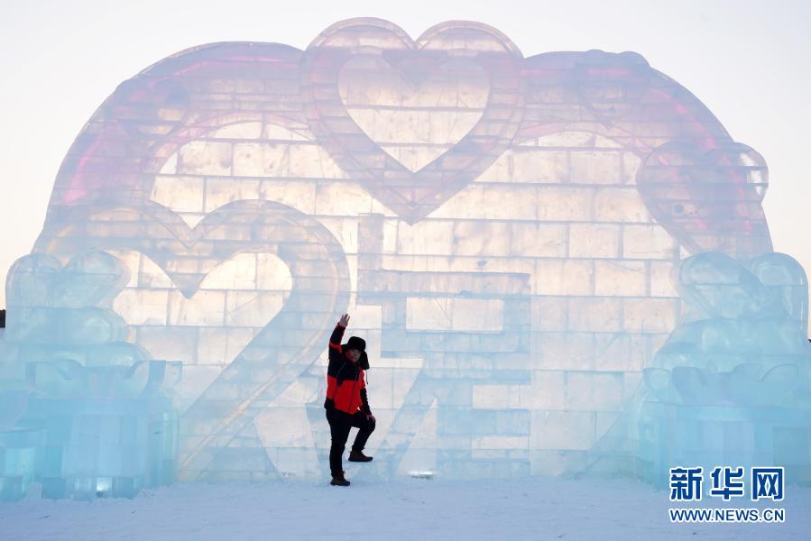 在哈尔滨冰雪大世界园区,孙宏岩在团队施工制作的冰雕艺术景观——比心墙前留影(2020年12月20日)。新华社记者 王建威 摄