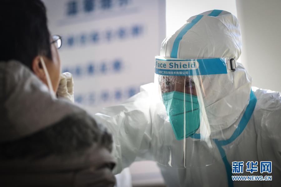 2021年1月1日,医护人员在沈阳市铁西区重工街道一处核酸采样点进行核酸采样。