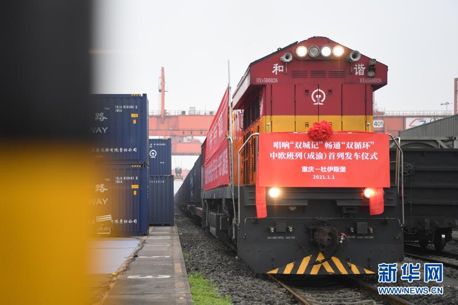 当日上午,重庆、成都两地同时发出2021年中欧班列(成渝)号第一趟列车。满载电子产品、机械零件、智能家电的两列中欧班列一路向西,驶往欧洲的德国杜伊斯堡和波兰罗兹。