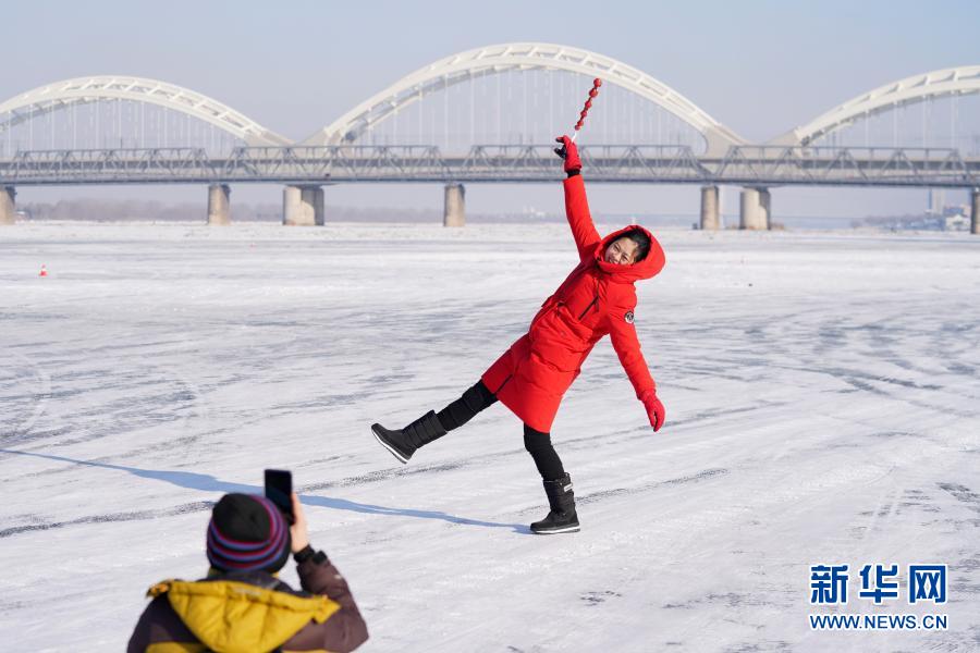 当日是新年第一天,在冰城哈尔滨,人们来到户外,与冰雪为伴,庆祝新年的到来。