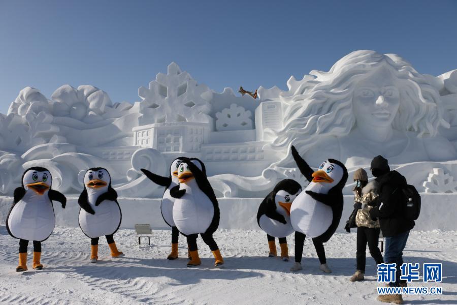 2021年1月1日,在河北省承德市丰宁满族自治县大滩镇一处雪雕前,游客与“冰雪企鹅”互动游玩。