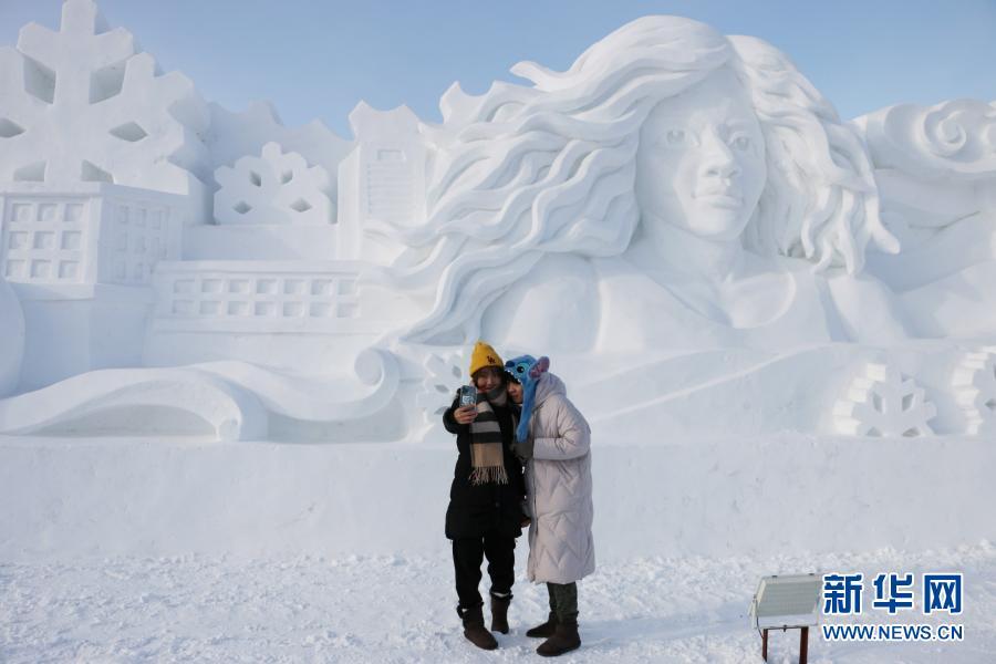 2021年1月1日,在河北省承德市丰宁满族自治县大滩镇,游客在一处雪雕前自拍留影。